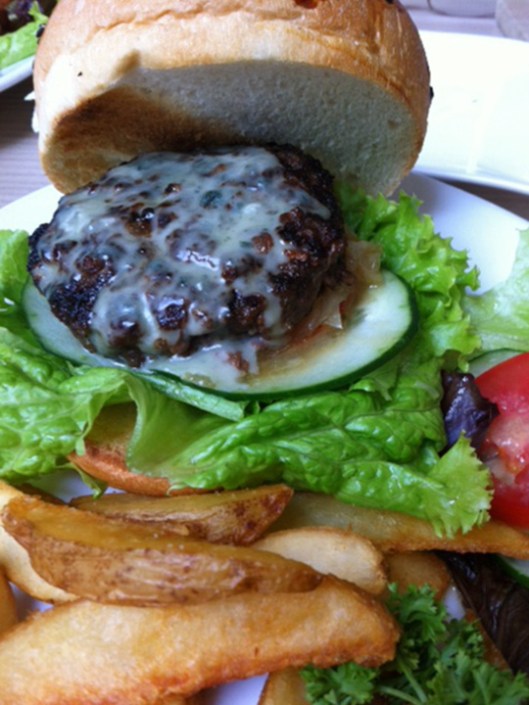 Mentore Burger: 1/3 lb US Angus beef burger with caramelized onions and blue cheese. Served with wedged fries.