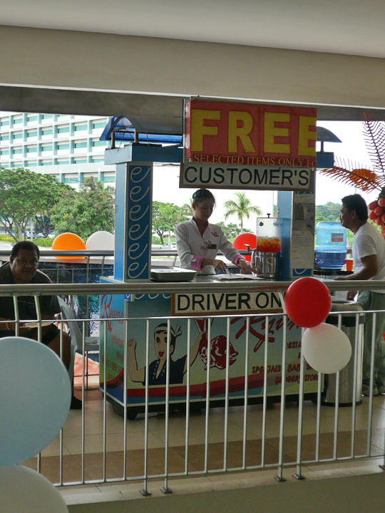 Aside from the restaurants, there is a Japanese grocery, a “specials and baby shop” (perfect for the japayuki fashionista in you), and even the owners’ toilet fixture exporting business office. Okashii, neh? Along the corridors, there’s a stall that serves free meals to the drivers or chauffeurs of the patrons, which often includes a bowl of noodles and some dimsum (like gyoza or even siopao). One man once asked for his free meal but the server looked at him closely and said “But, sir, you are not a driver!” To which the man replied “Yes, I am! I drove my wife here… that makes me her driver!” I’m not sure if the man was given his free meal, though. And there are also kiosks that make and serve Japanese hopia, unusual fishballs in baking tins, and other Japanese snacks.
