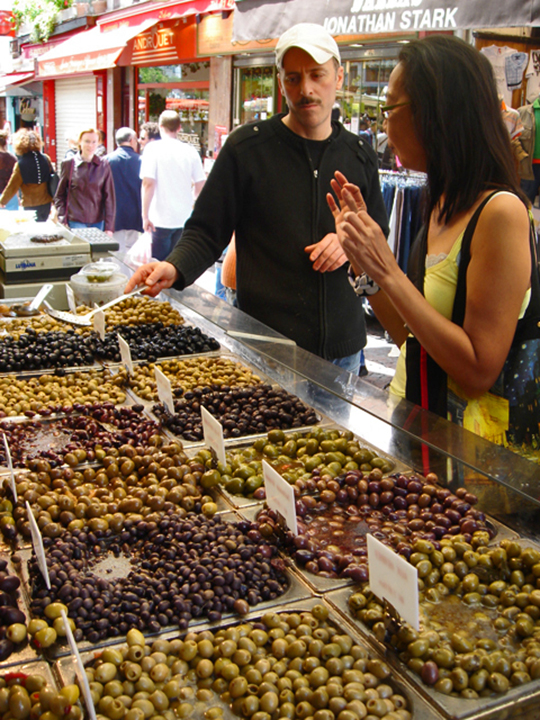 I never realized just how many kinds of olives there are until I came upon an olive merchant at the Rue de Mouffetard where he let me sample the numerous varieties and flavors of olives from all over Europe. Greek kalamatas, Turkish dormatas, Spanish manzanillas, French pichoulines and classic Niçoises and many many more. I got dizzy trying to choose which varieties to buy, but I think I ended up selecting 3 kinds to go with the cheeses I bought.